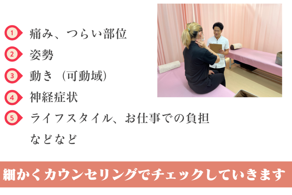 当院ではカウンセリングでお仕事の状況や日常生活の動作など丁寧にお聞きし、少しでも妊娠中を楽に生活出来るようにサポートさせて頂いております。