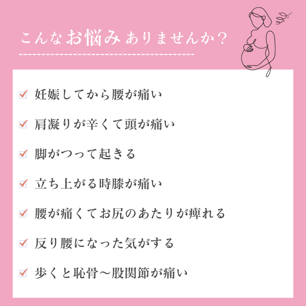 妊娠して初めてぎっくり腰や肩こりからくる頭痛に悩まれる方は多くいらっしゃいます。